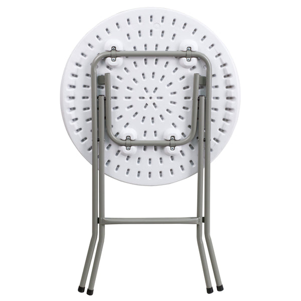 This petite sized folding table can be used in banquet halls, cafeterias, or in the home. This table is a great solution for temporary setups for displaying food or other small items. The durable blow molded top is low maintenance and cleans easily. Easy to fold legs fold flat under table top to make storage more convenient and for better portability. This table is commercial grade to withstand everyday use in the hospitality industry.