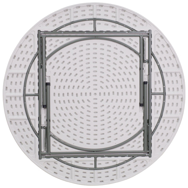 This round folding table is 6 feet long and is beneficial in a multitude of settings that include banquet halls, conference centers, cafeterias, schools and in the home. The table can be used as a temporary seating solution or be setup for everyday use. The durable blow molded top is low maintenance and cleans easily. The table legs fold under the table to make storage more convenient and for better portability. This table is commercial grade to withstand everyday use in the hospitality industry.